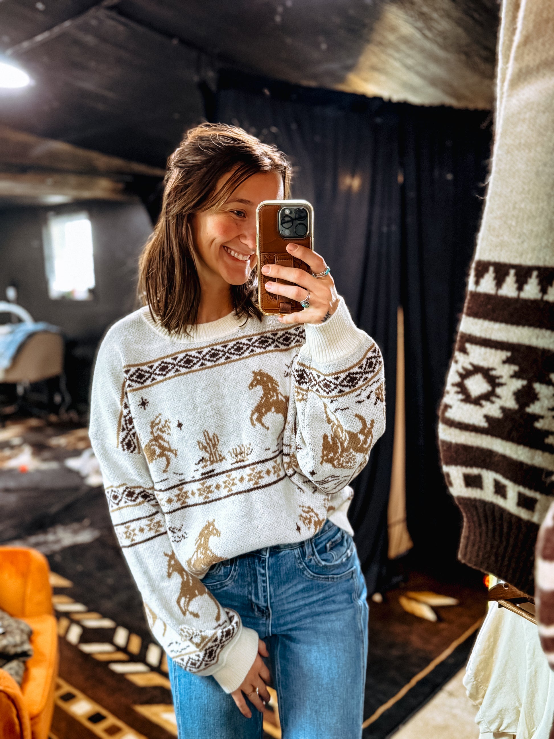 Oversized Western Knit Sweater Top - Round Neck - Drop Shoulder - Long Sleeve - Ribbed Hem (Model height: 5"8", wearing a Small